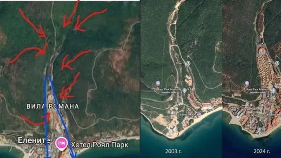 "Високи води"… Невинни сред разрешаващите и одобряващите институции по ЗУТ просто няма!", твърдя Ромиана Благоева, която споделя друг стряскаш колаж, на който се виждат картографски данни. На тях се вижда развитието на застрояването в района в период от 11 години.